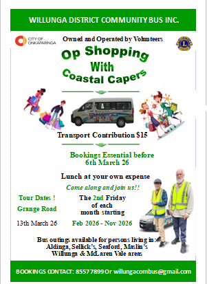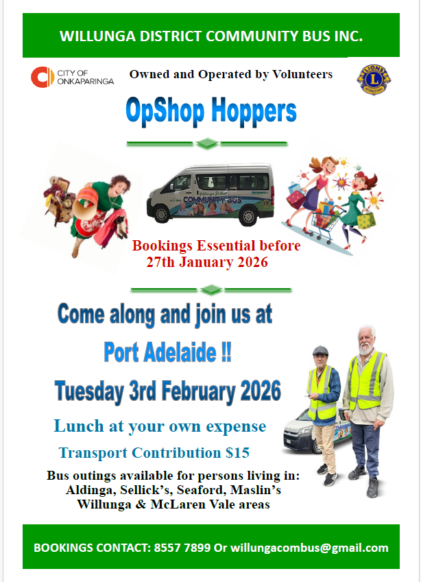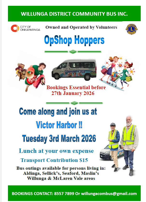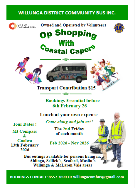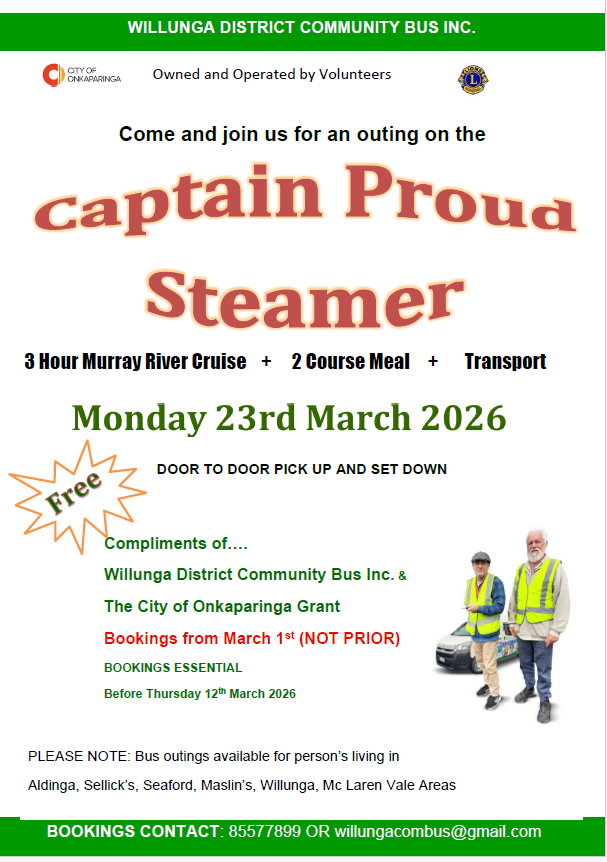 Willunga District Community Bus is all about connecting people in the community and what better way to get out than joining us for an enjoyable day trip. Everyone is welcome and we often have a great mix of people on our day trips, making them a great social event.